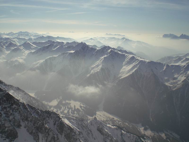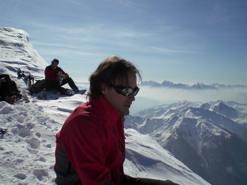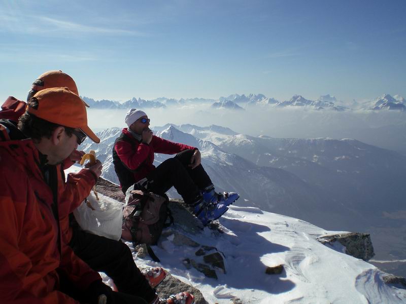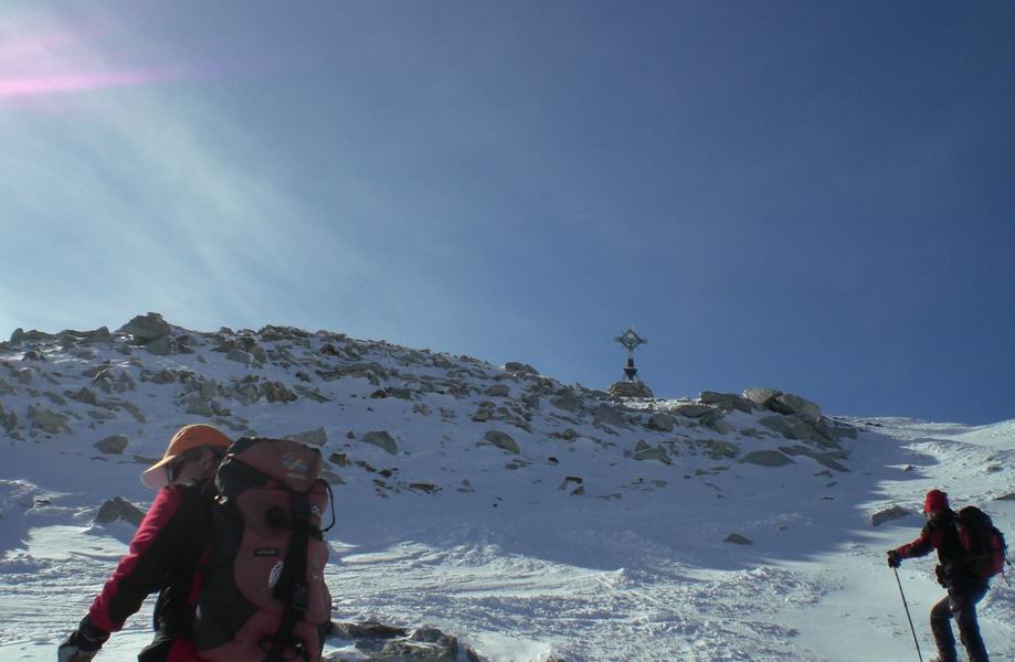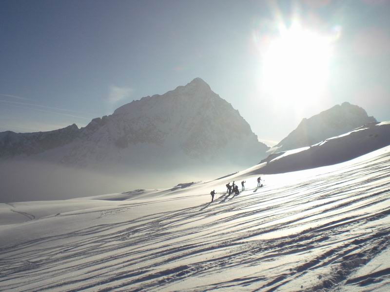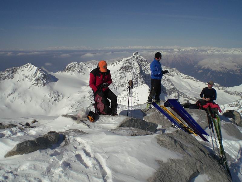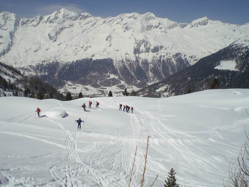 Ore 6.30 colazione (panino, burro, marmellata, te) al Rif. Roma (2.276). Il sole e sorto da poco (cambio dell'ora) e partiamo 2 min prima di un gruppone di ciaspolatori. Salita tranquilla, quasi senza pendolini, lungo tutto il tristenferner la vedretta di Ries occidentale fino alla cima del M.Magro 3.275.