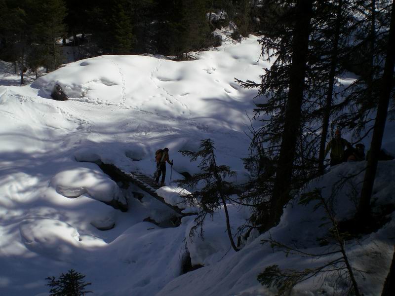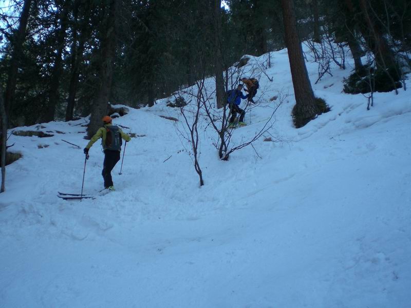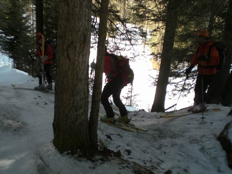 Poco prima del rifugio la neve si fa crostosa fino ad arrivare nel bosco dove