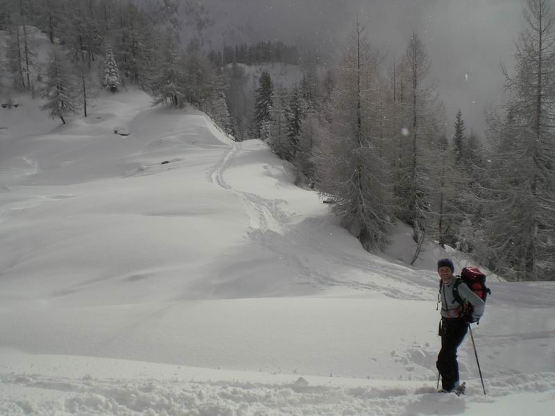 Dopo le intense nevicate di fine novembre decidiamo di smuovere gli sci. La neve è tantissima. Vada per un itinerario super sicuro. La pista DiPrampero non è ancora aperta e l'ovovia del Lussari non è in funzione. Si va anche se il meteo è bruttino.
