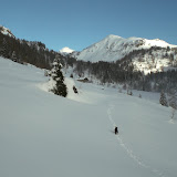 Per la discesa ci spostiamo sul versante opposto per evitare la noiosa strada. A nord c'è bella neve polverosa. Seguiamo le tacche sugli alberi del sentiero estivo 209.