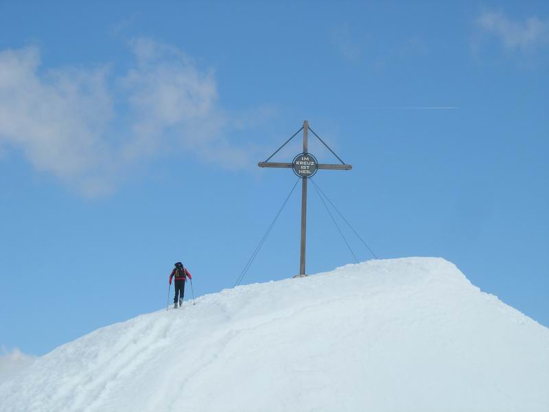Giunti in cima lasciamo gli sci e attraversiamo a piedi la breve crestina per giungere alla croce di vetta,