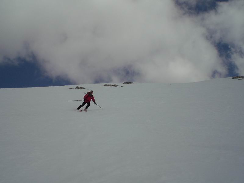 Salita su neve rigelata durante la notte ma non servono rampant. Zero termico a 2400m. Per fortuna c'è qualche nube che ogni tanto cela il sole. Siamo un po' tardi per cercare firn d'hoc ma le nuvole ci danno una mano. E poi è pasquetta... l'importante è far festa.