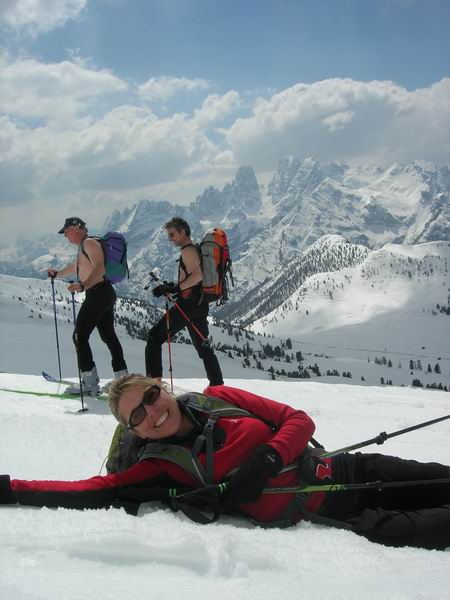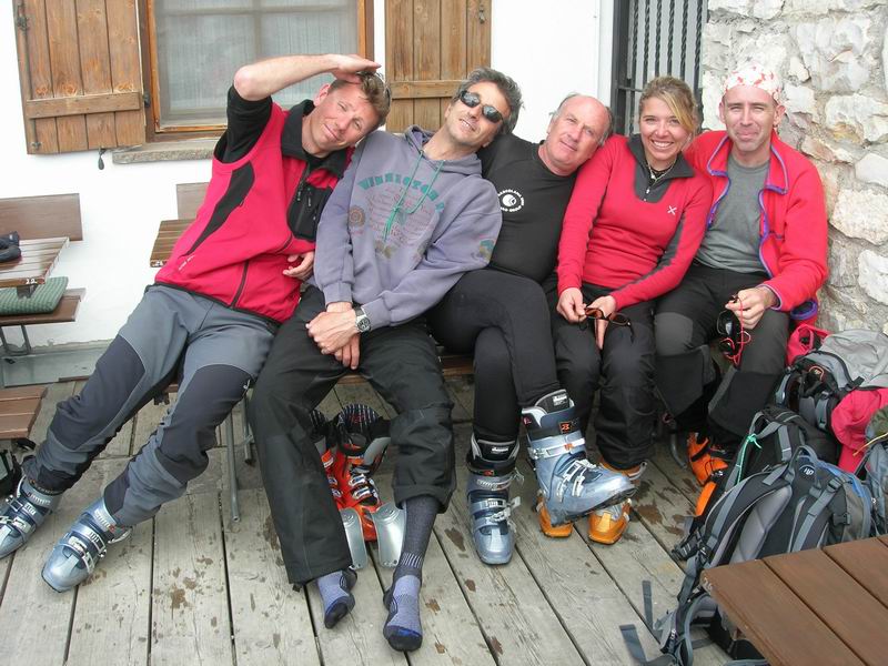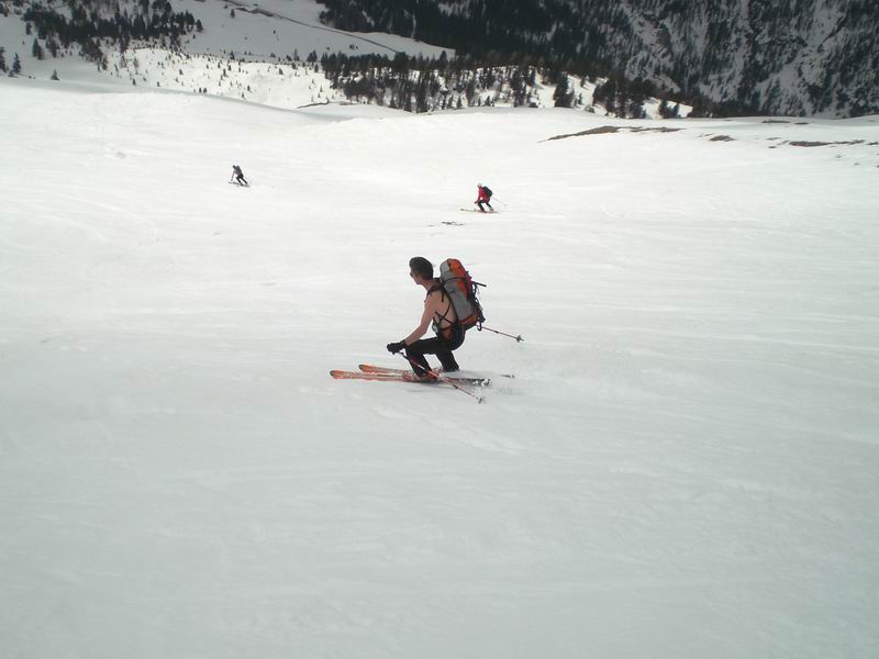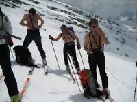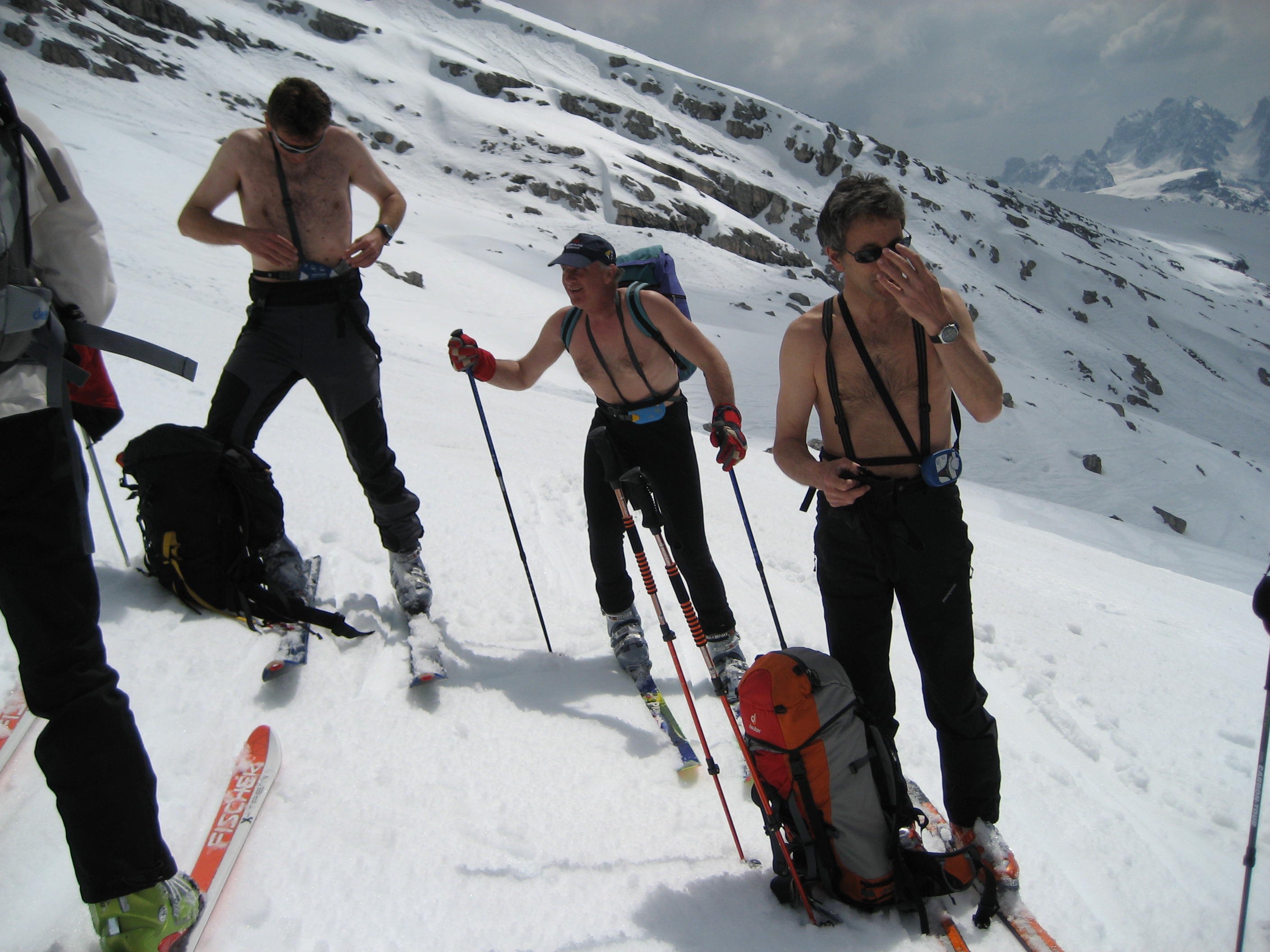 Su questa neve tutti sono campioni di sci. La temperatura è gradevole.... la compagnia divertente.... ed il buon umore è alto tanto che i maschi si tolgono giacca e maglietta... senza però rinunciare ad'ARVA e zaino.