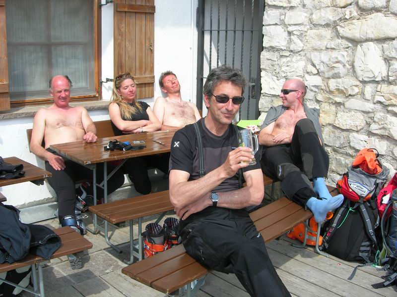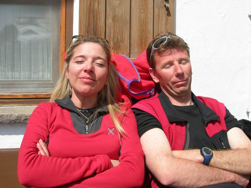 Finiamo a mangiare al rifugio Pratopiazza (gnocchetti con finferli). Post mangiata ci crogioliamo al sole.... non facendo una gran figura.... :o)