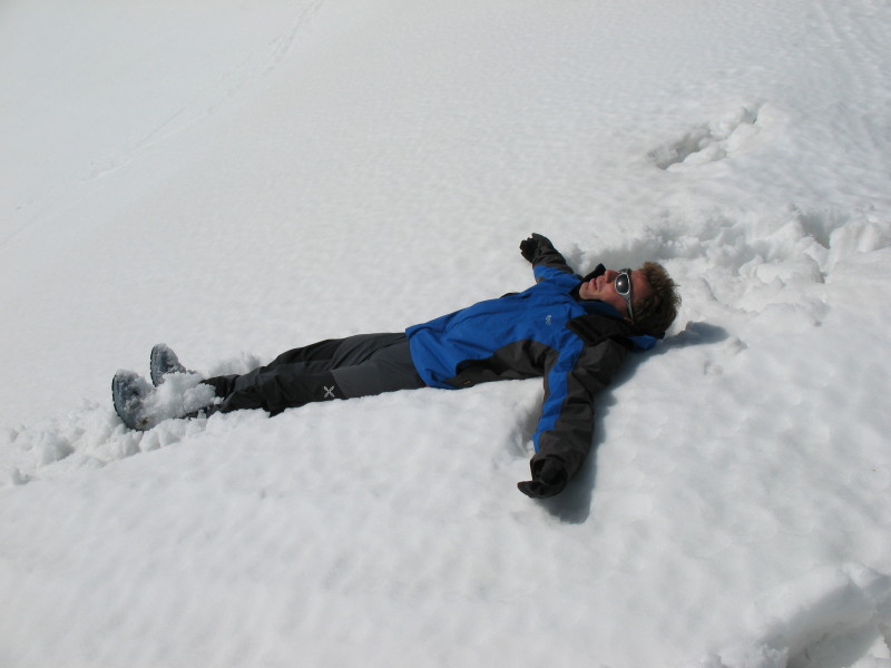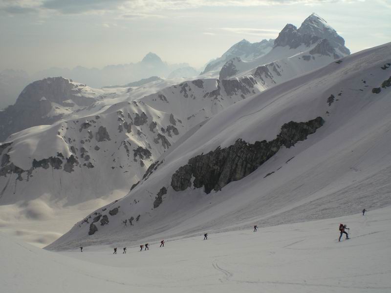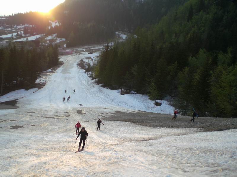 Bella giornata di sole. Dalla sella scendiamo su neve inaspettatamente buona. Era previsto un pantano da caldo e invece si scia molto bene.