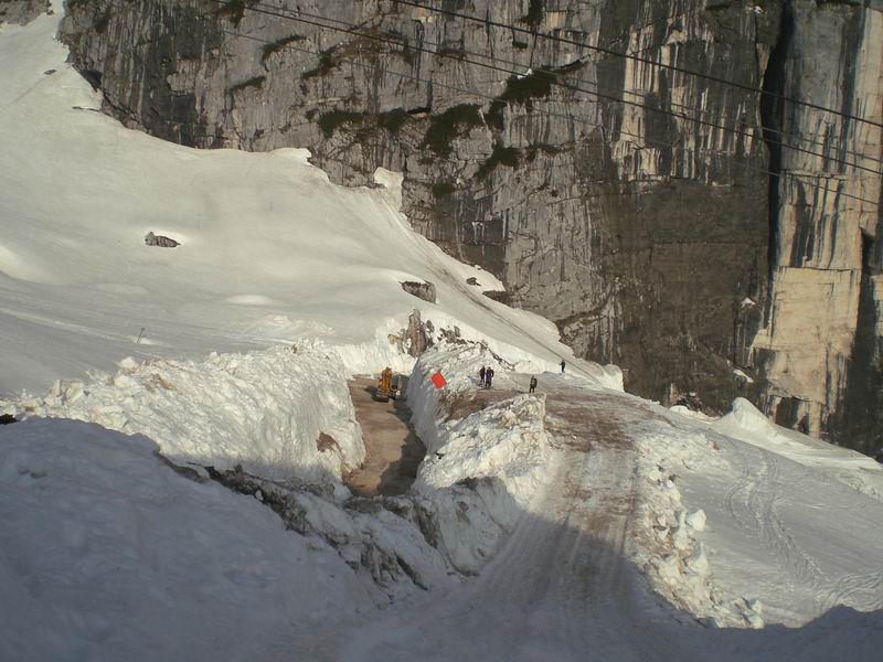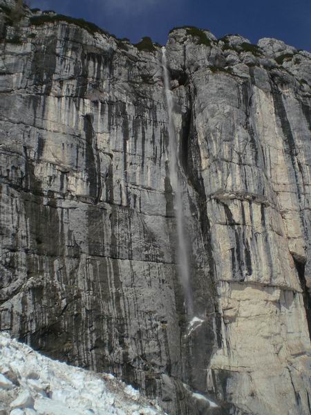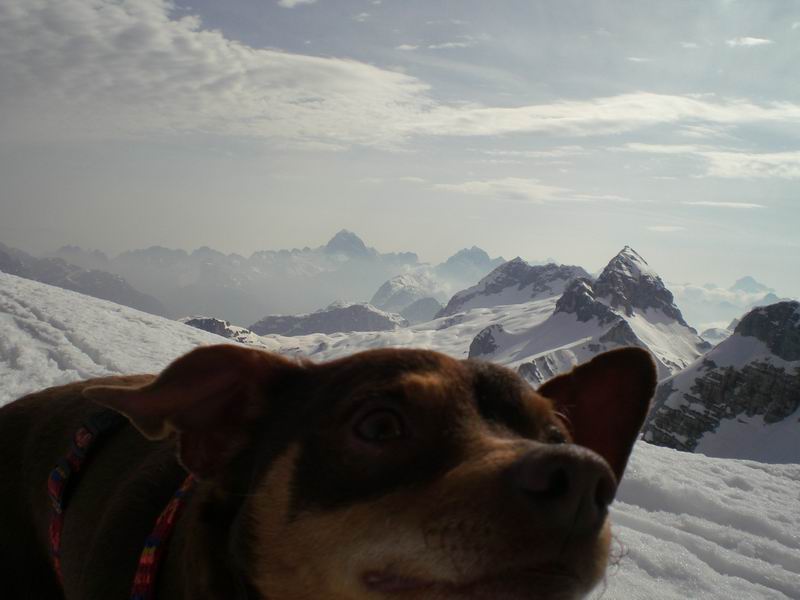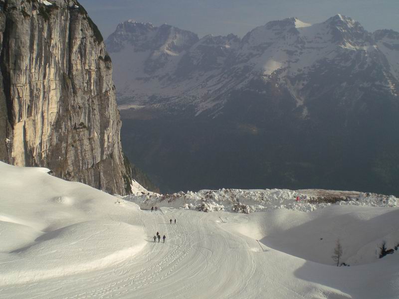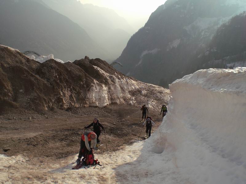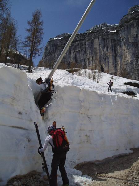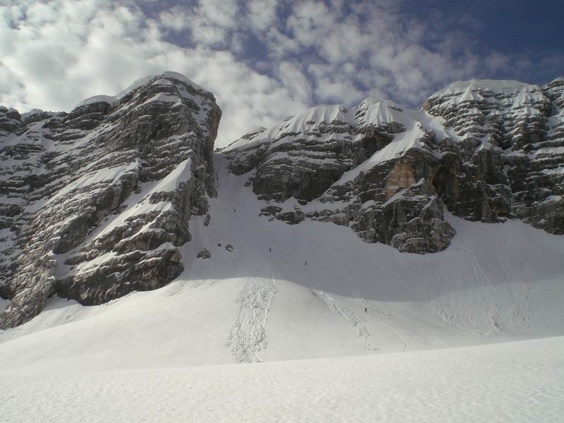 Imbocchiamo la pista del Canin. Andiamo a sinistra verso la paretina del Bila Pec per evitare la strada o stiamo sulla destra?. Fox davanti sceglie la destra.. .e... subito dopo arriva, sulla sinistra, una scarica di neve mista sassi dalla parete. E' quasi come una cascata e dura ininterrottamente circa 3 minuti.