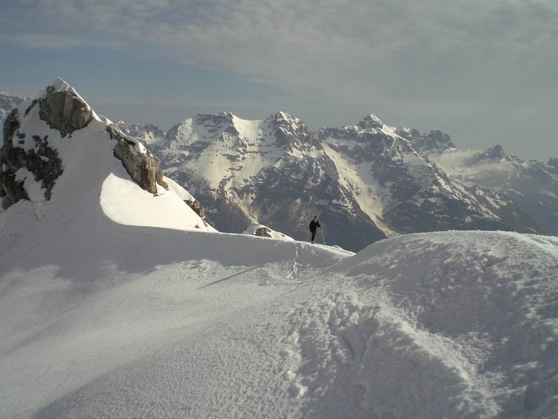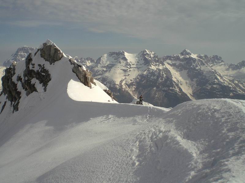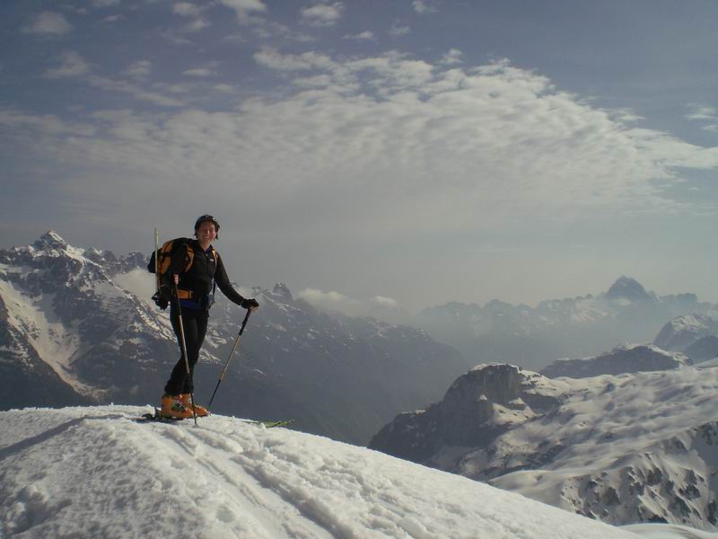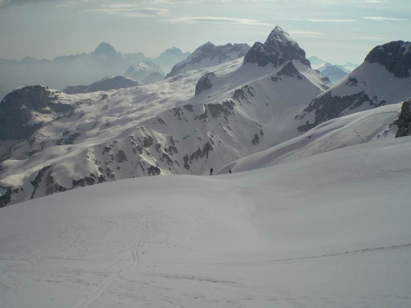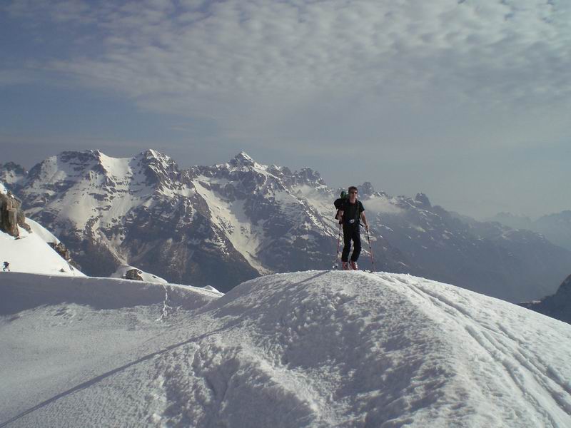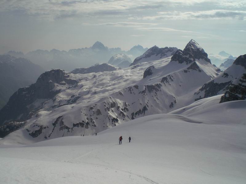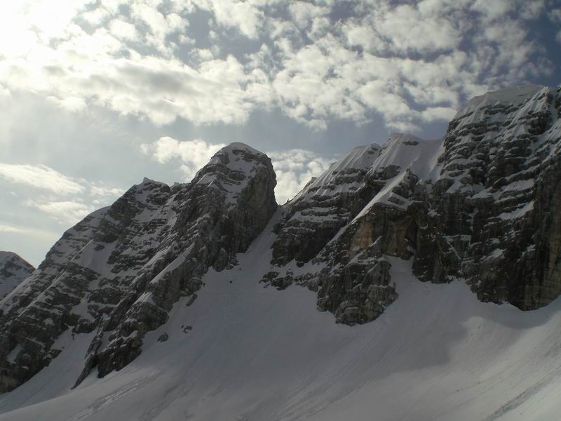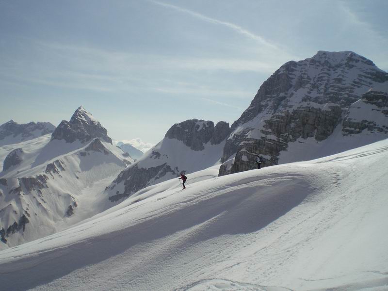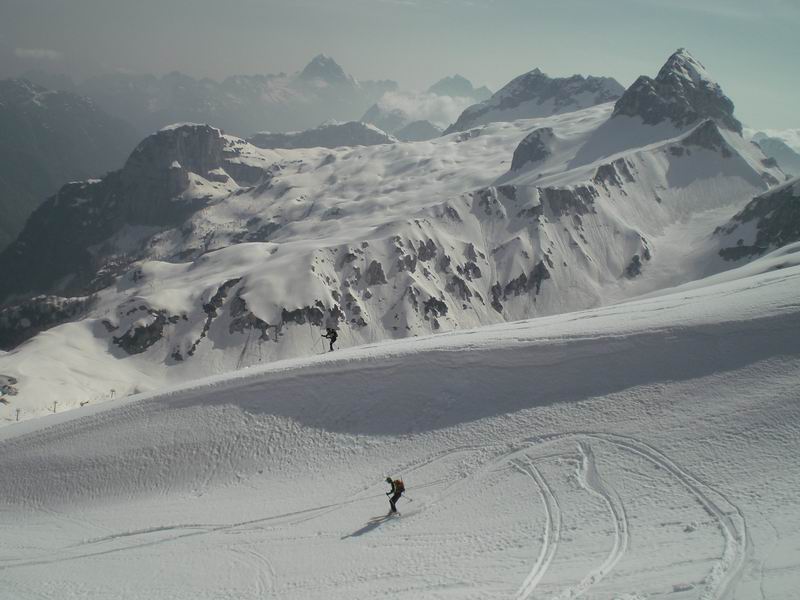 Per evitare il traverso sotto le rocce del Gilberti, dalla sella Ursic puntiamo in direzione nord verso sella Bila Pec. La neve tiene e si scia bene. Gran divertimento.