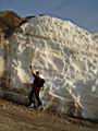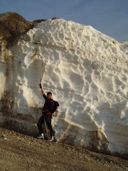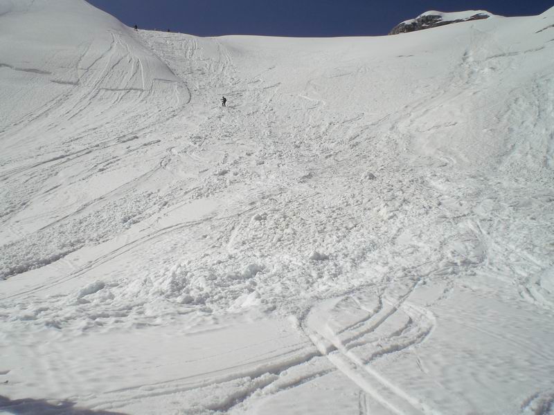 A quota 2100 circa, l'amico fotografo, che in quel momento era davanti, innesca una piccola valanga di superficie di neve bagnata. E' un piccolo fiume in movimento, lento, vista la pendenza non troppo accentuata che per 1 minuto fa sentire il suo fruscio.