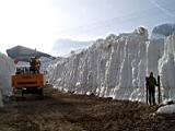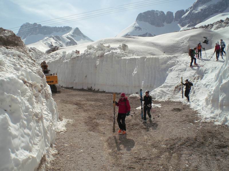 Brevissimo tratto (3 minuti) con gli sci in spalla. Poi si risale la pista di destra perchè quella di sinistra è completamente devastata da un'autostrada scavata nella neve per far arrivare le ruspe in conca prevala. E' in costruzione il nuovo impianto e la nuova pista che rovineranno la conca.
