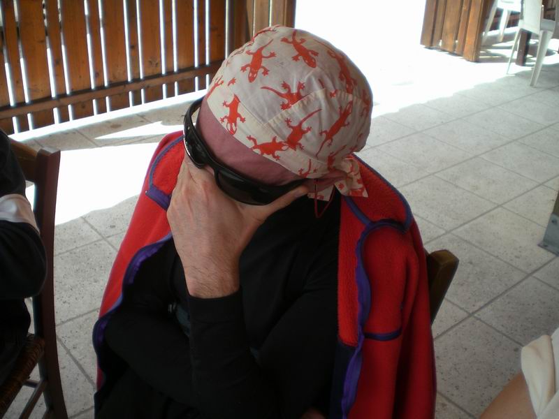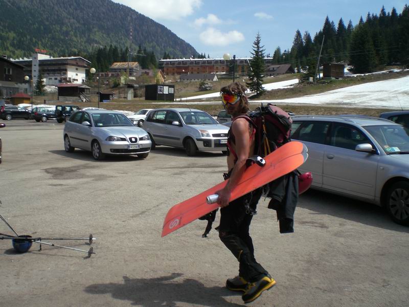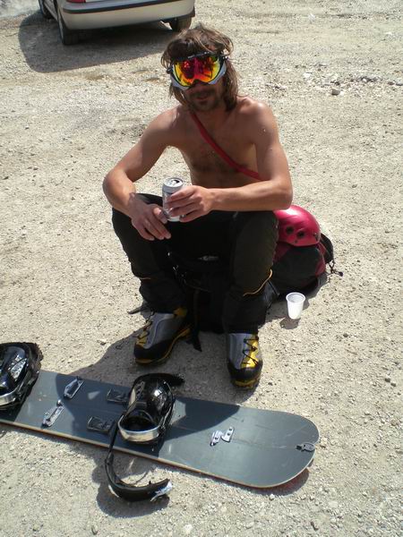 Arrivati al parcheggio, dal frigo del furgone di Andrea e Paola escono agoniate birre fresche per tutti. Mentre aspettiamo Lorenzo, Elena e Piero ecco arrivare Andrei e Tibor che hanno conquistato la Cima Gilberti. Due "fenomeni" soprattutto Andrei con gli occhiali stile Goldrake e l'immancabile splitboard.