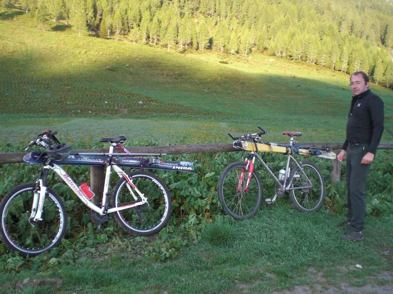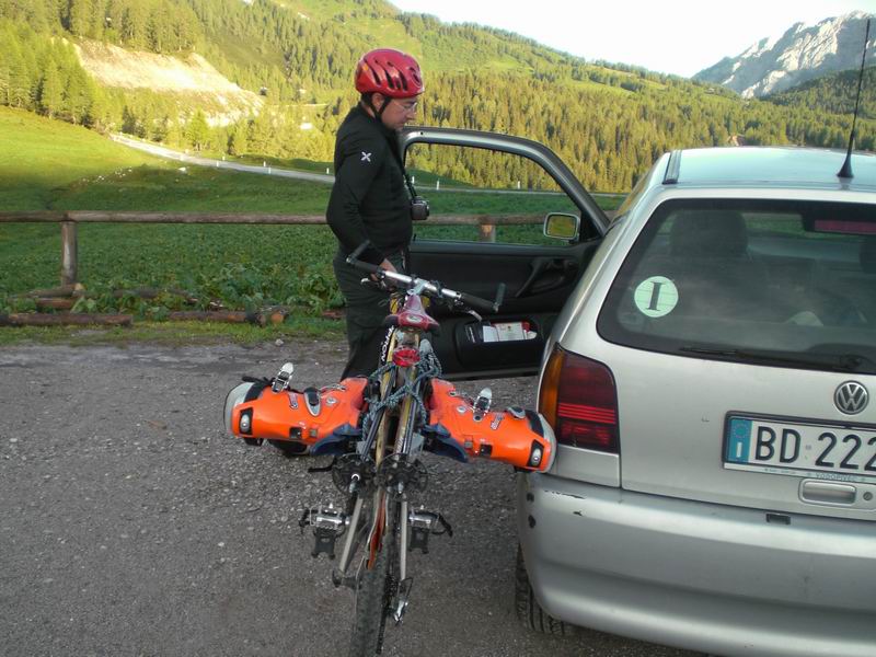 Con cordino ed i lacci degli attacchi leghiamo gli sci allo stangone della bicicletta. Fox mette gli scarponi in zaino. Charles li attacca sugli sci in stile elicottero Apache. Ore 6.20 siamo pronti.