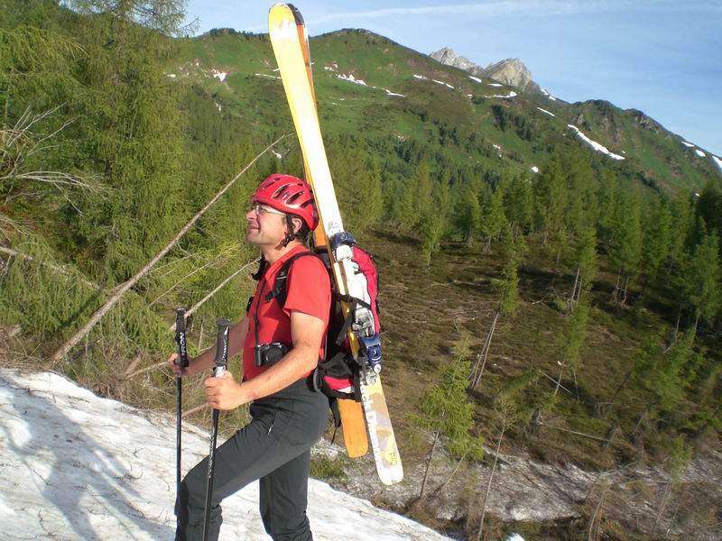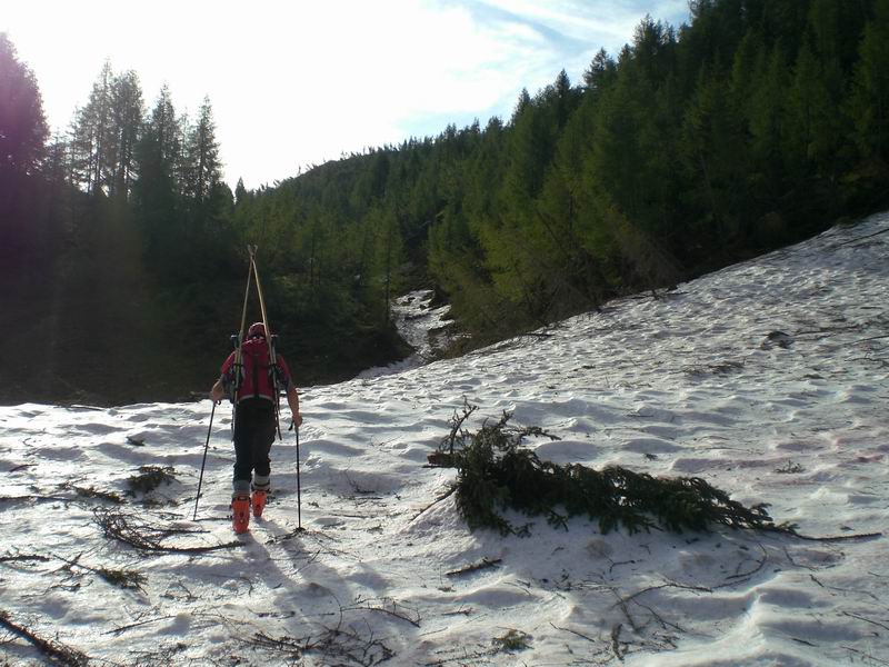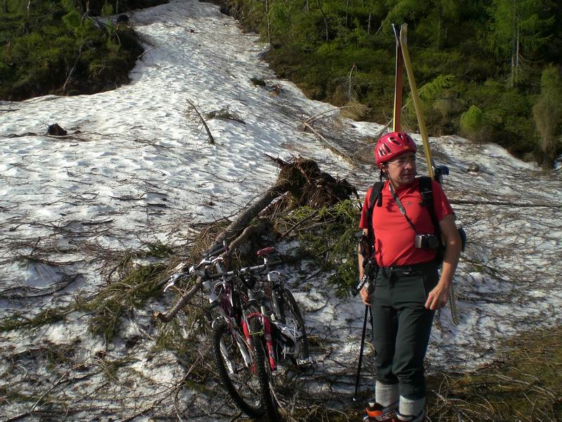 Nella parte finale scendiamo in un canalino sporco di rami ma cmq sciabile che ci porta con gli sci ai piedi fino alle biciclette.