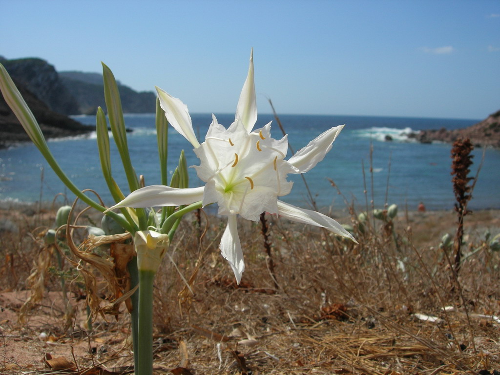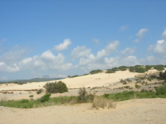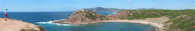 Ritorniamo indietro e ci fermiamo sulla sabbia di cala cipolla. Molto suggestiva e primo impatto con la trasparente acqua sarda. Alessia si addormenta in spiaggia. Anka non trova pace e vaga su e giù per le alture circostanti a caccia di foto. Fa caldo (34°C) ma per fortuna qui il vento non manca. |
