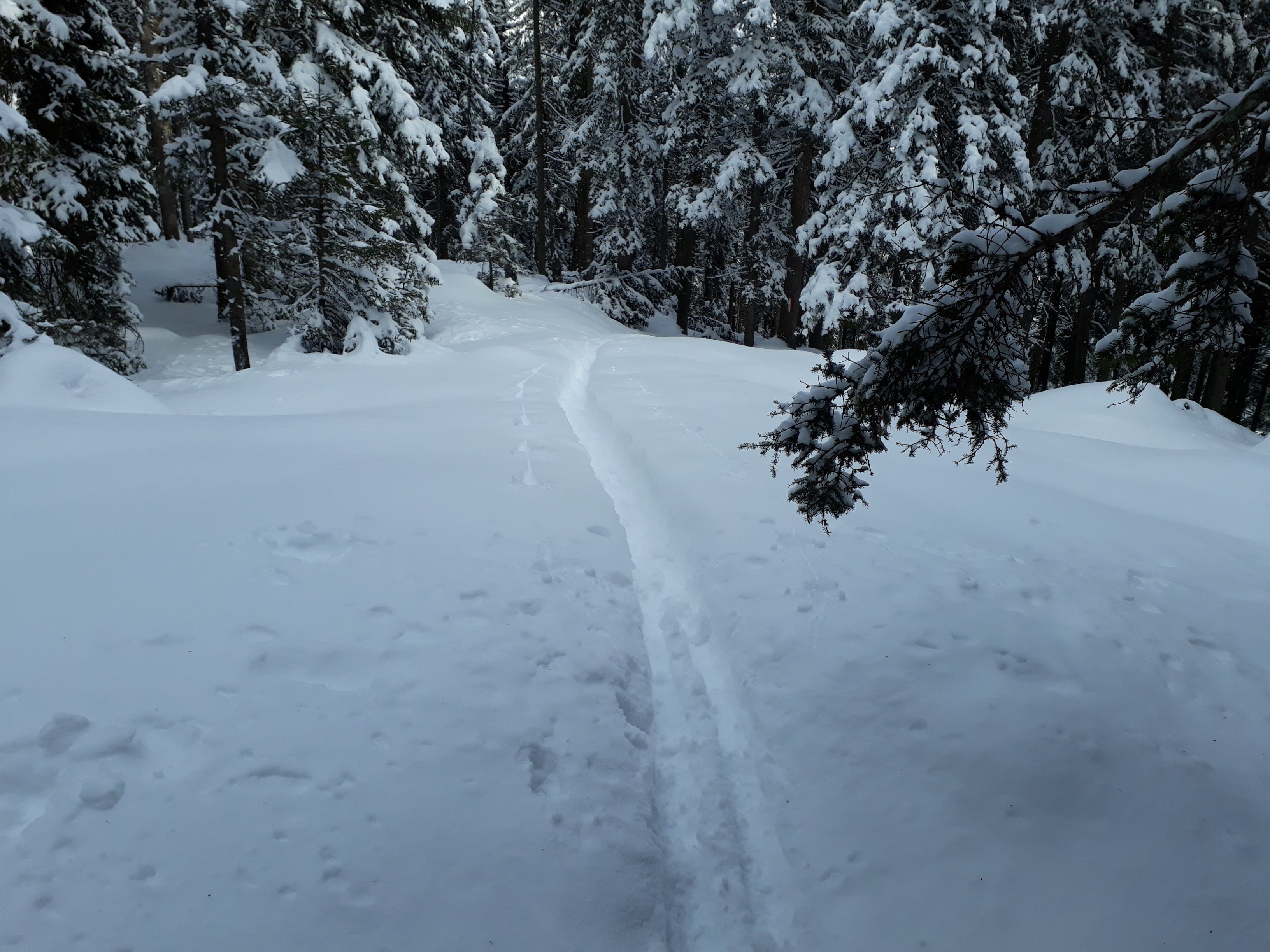 Discesa impagabile in neve fresca. Prima su pendii aperti, poi nel bosco poi lungo la forestale ed infine nei pratoni innevati che mi hanno riportato all'albergo.