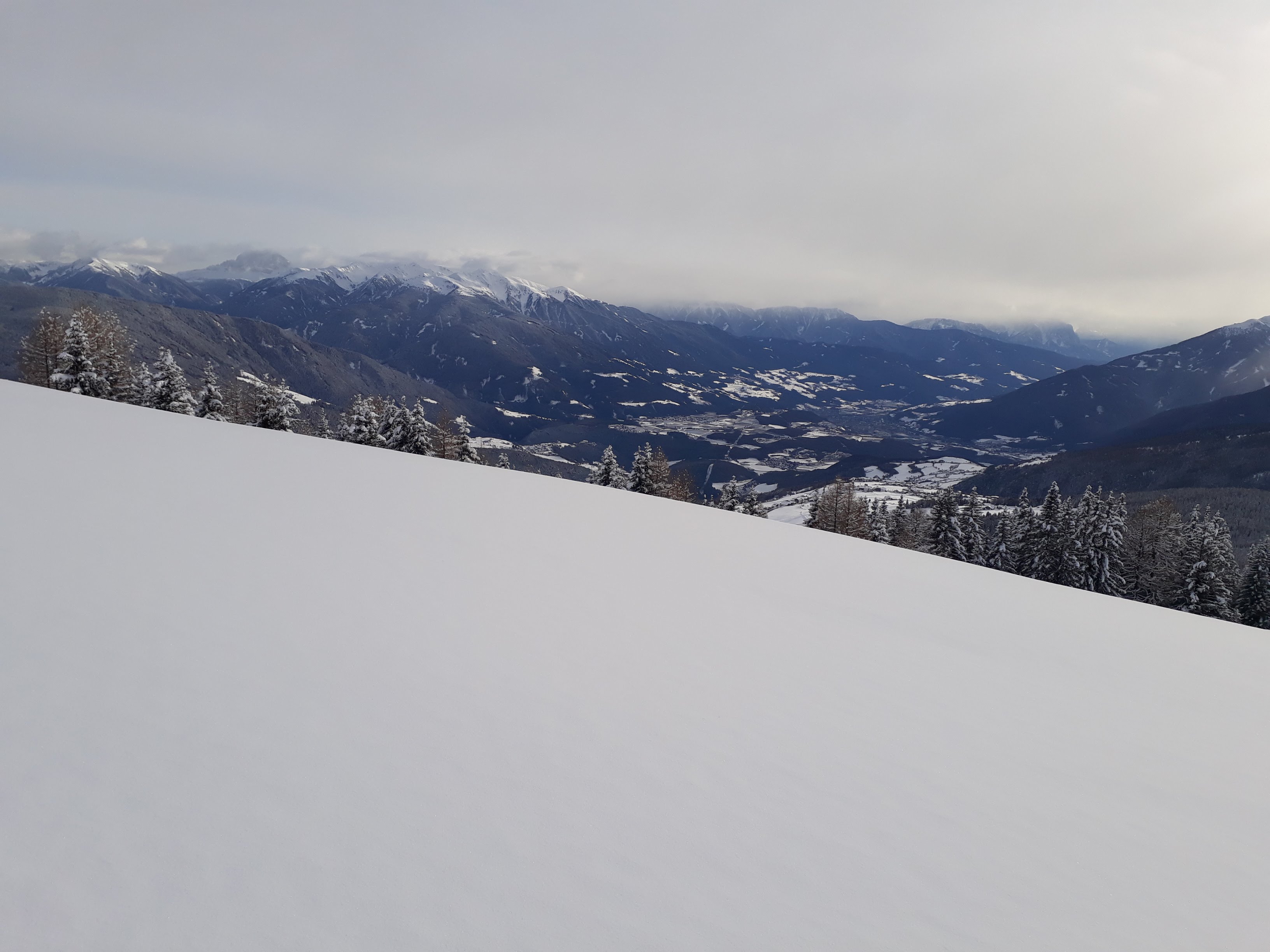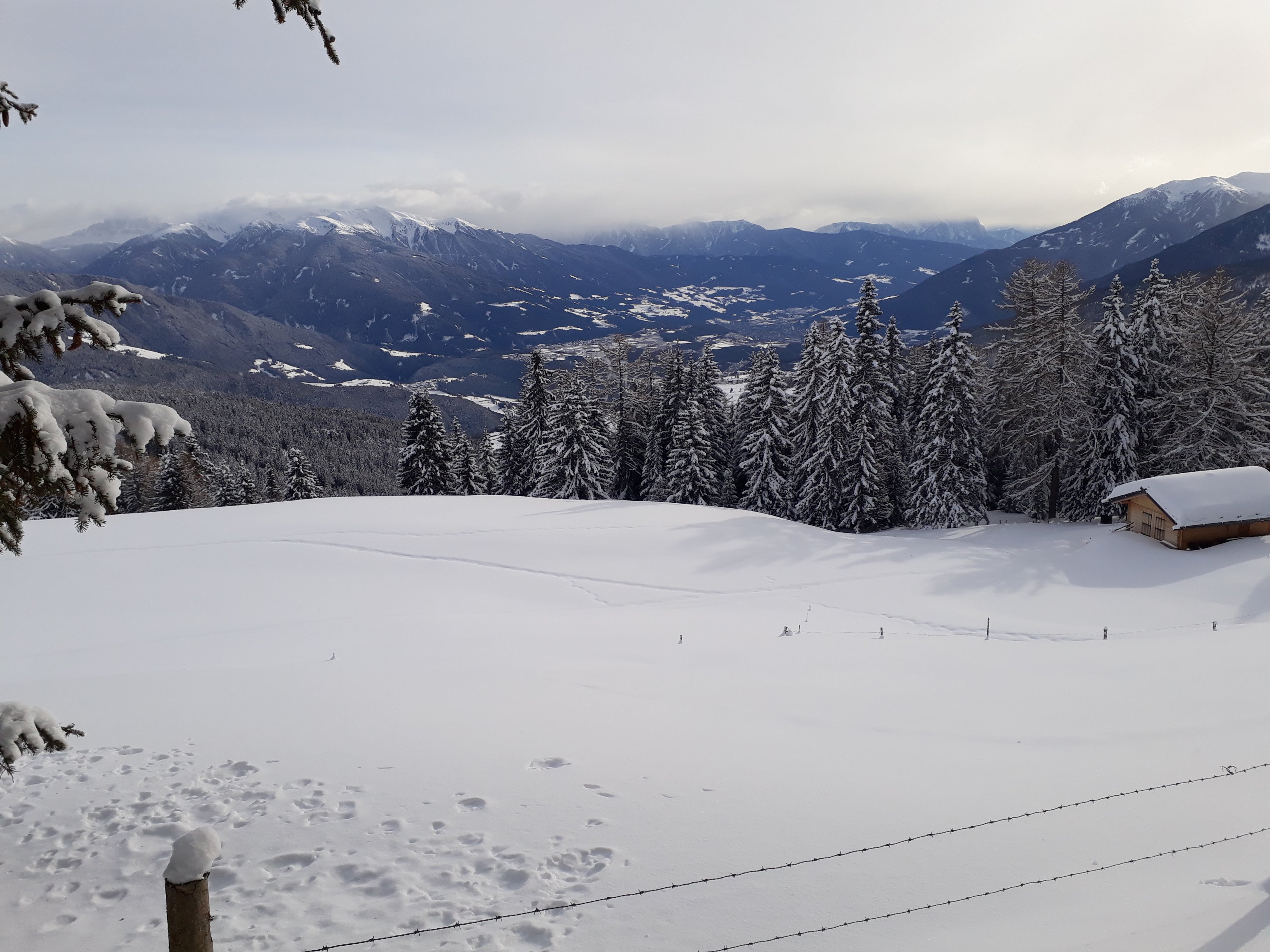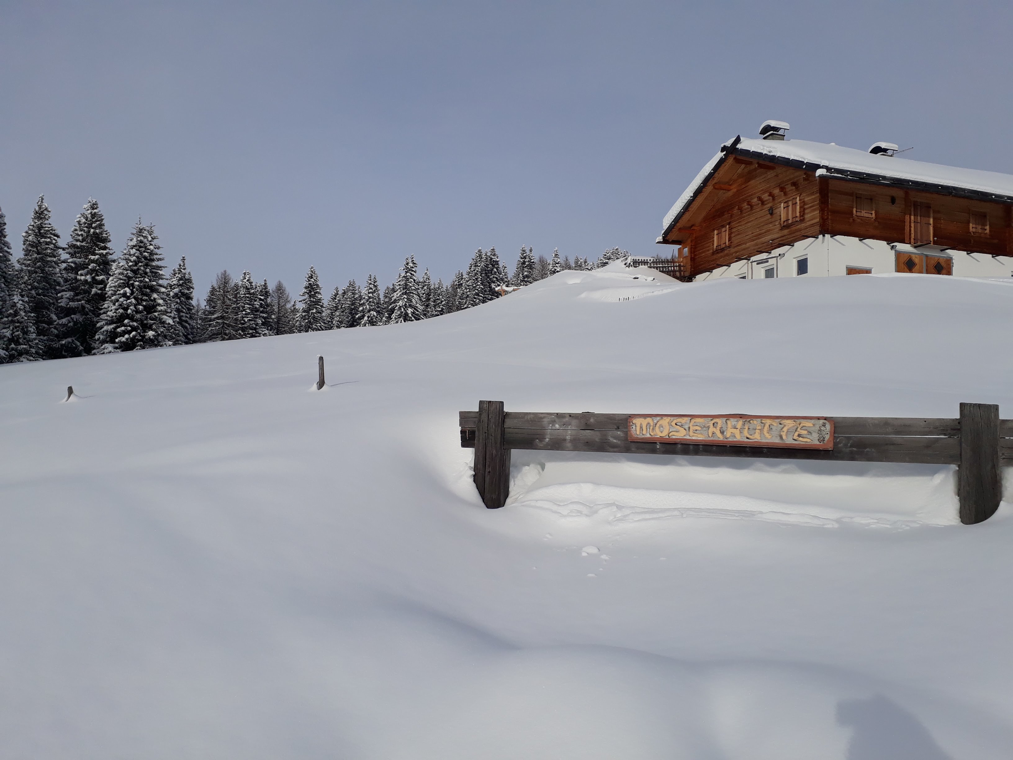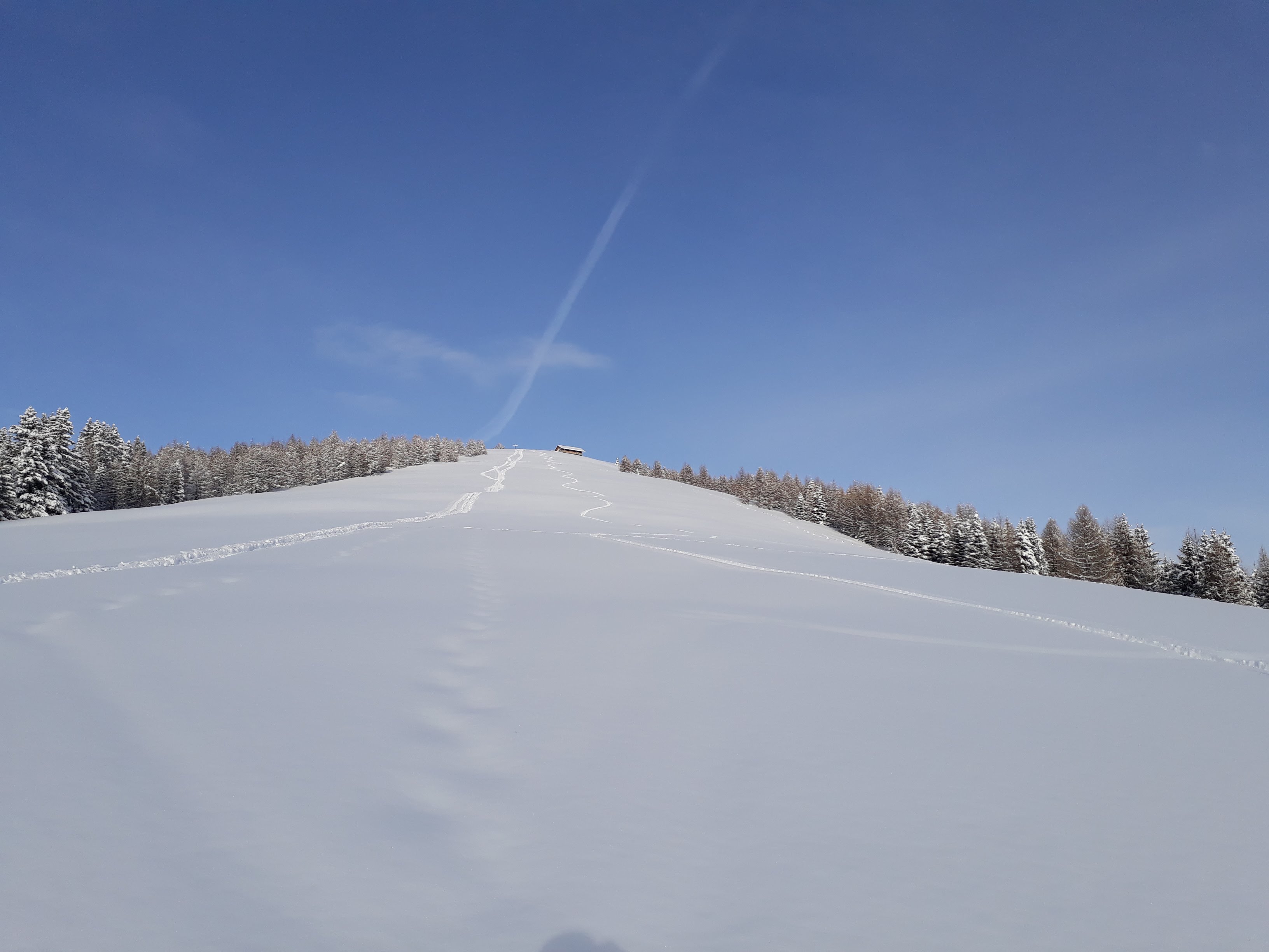Attraverso i campi di Maranza si raggiunge l'arrivo dello skilift Brunner in località Winkler. Si segue la forestale segnavia 14 in direzione nord addentrandosi nel Moserwal fino a quota 1600. Da qui ho tagliato nel bosco verso ovest lasciandomi trasportare dal pace e dal silenzio del bosco. Si sale qualche metro battendo traccia in neve fresca fino a raggiungere la forestale n. 6 che si segue (pianeggiante) in direzione nord fino all'incrocio con la 12A. Da qui si sale nel bosco fino a quota 1700.