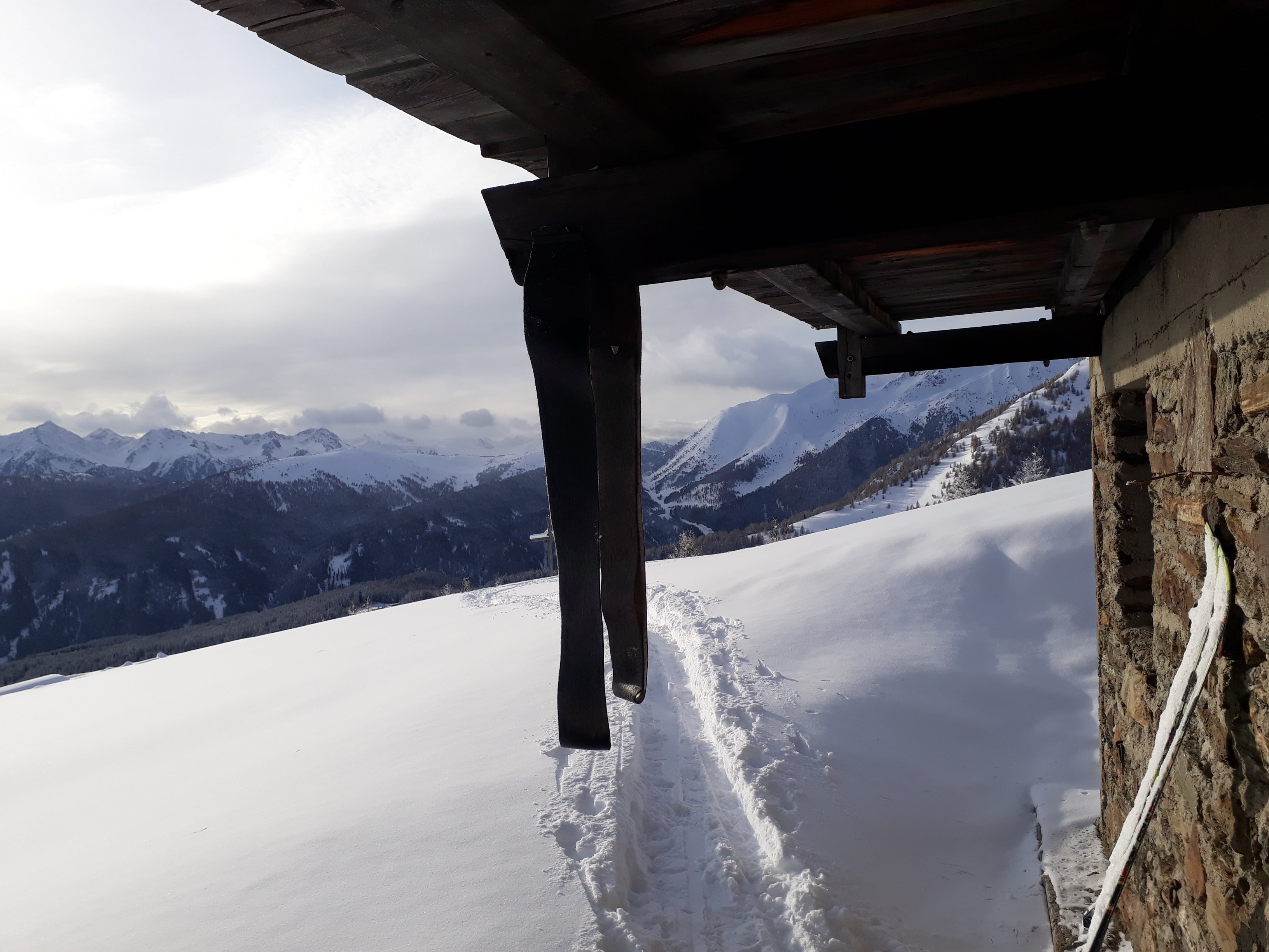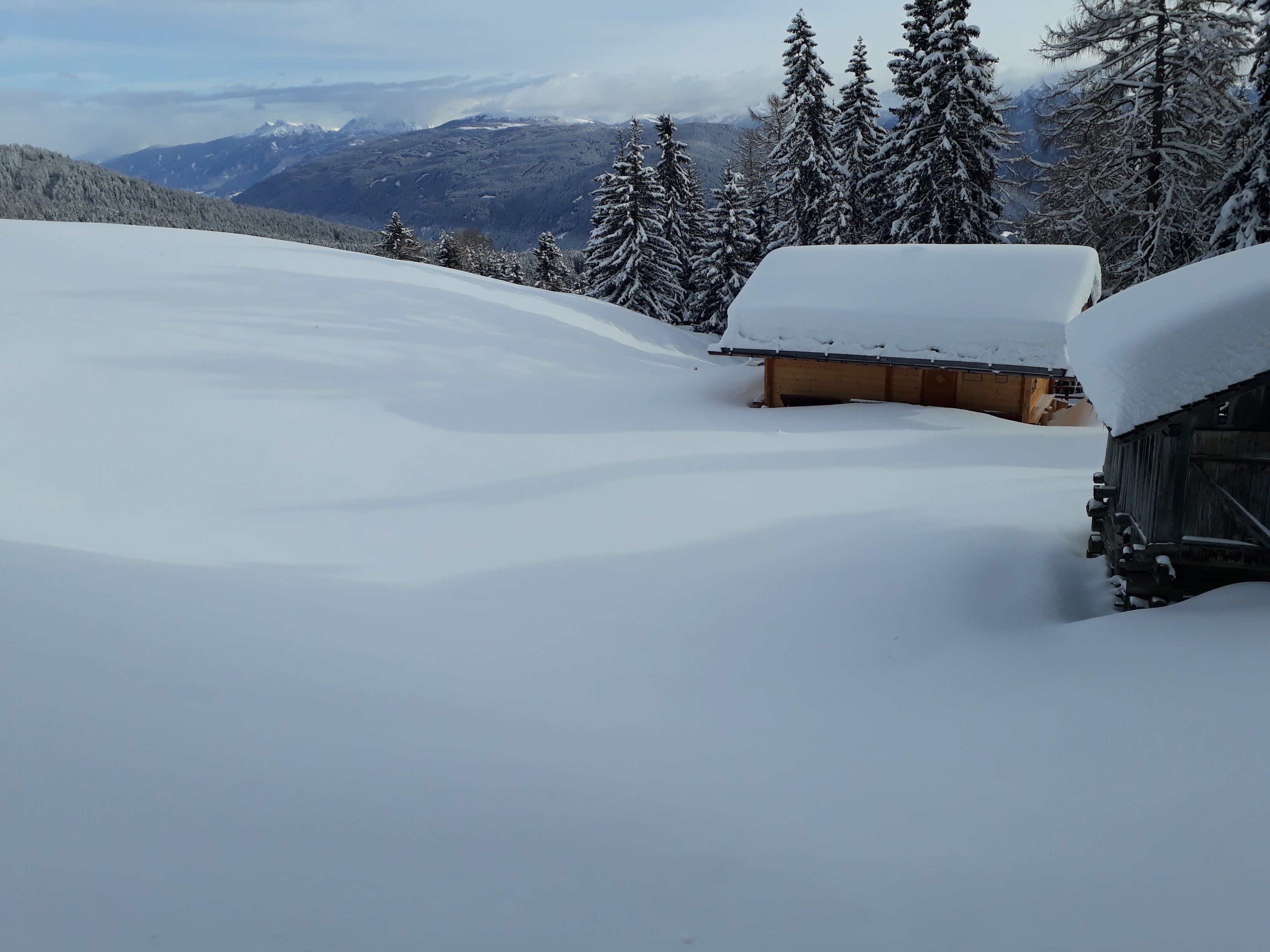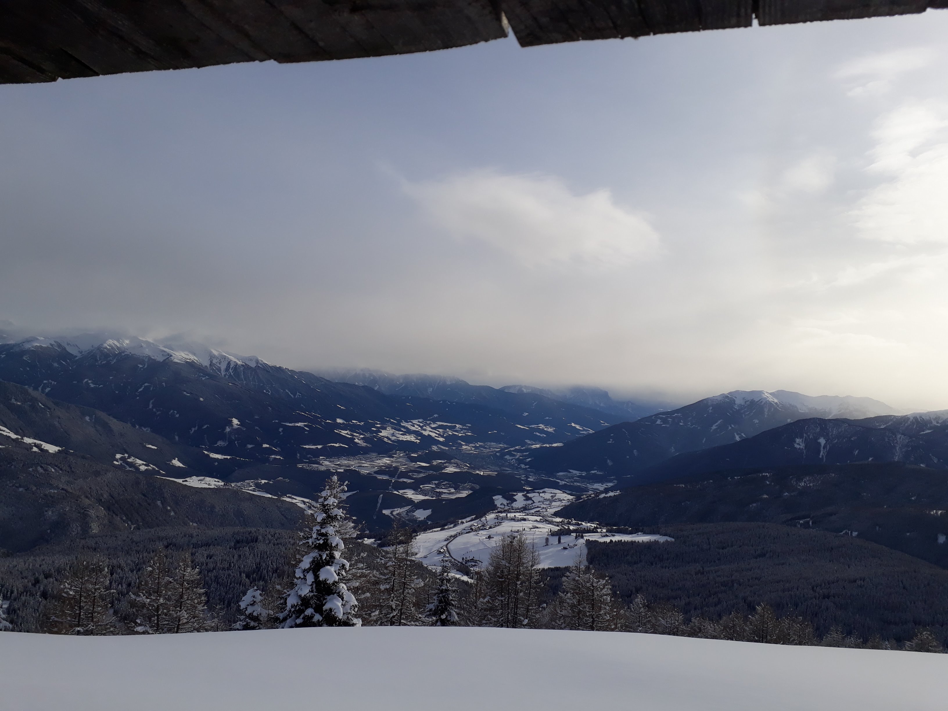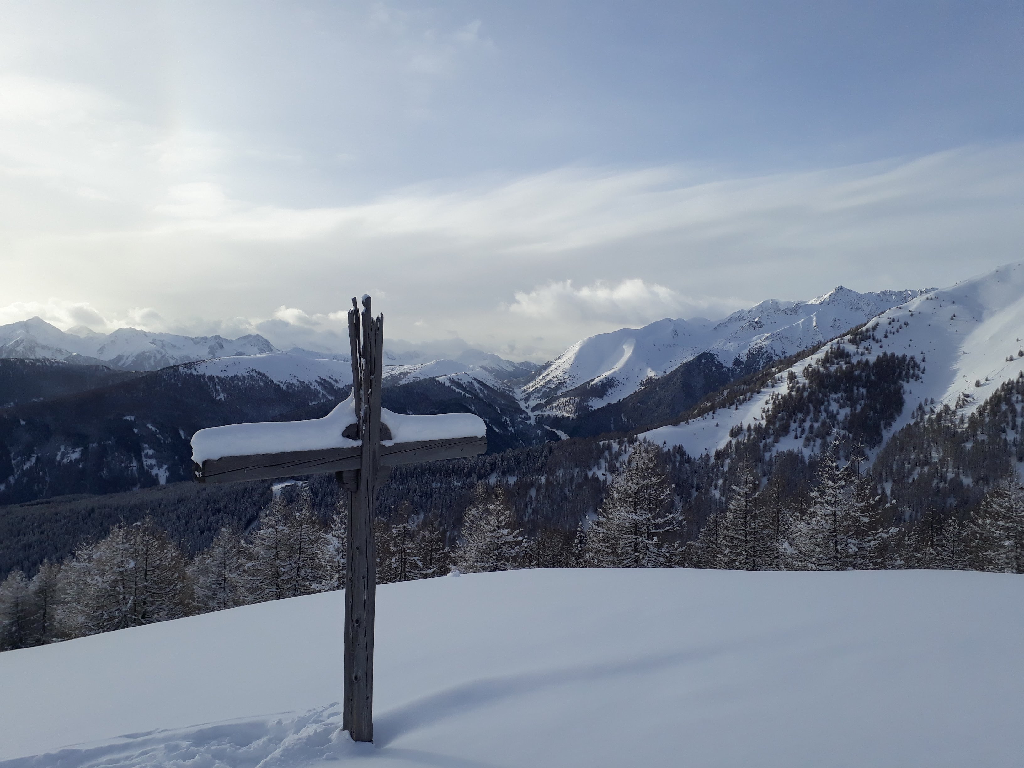 Attraverso i campi di Maranza si raggiunge l'arrivo dello skilift Brunner in località Winkler. Si segue la forestale segnavia 14 in direzione nord addentrandosi nel Moserwal fino a quota 1600. Da qui ho tagliato nel bosco verso ovest lasciandomi trasportare dal pace e dal silenzio del bosco. Si sale qualche metro battendo traccia in neve fresca fino a raggiungere la forestale n. 6 che si segue (pianeggiante) in direzione nord fino all'incrocio con la 12A. Da qui si sale nel bosco fino a quota 1700.