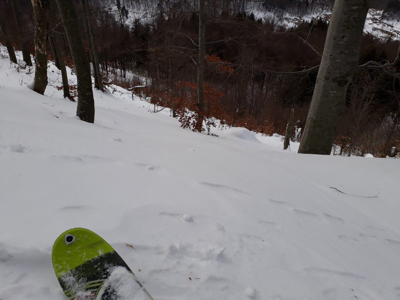 Discesa lungo la cresta in direzione ovest su neve sciabile compattata dal vento. Ultimo tratto seguendo la pista da sci che riporta a Lokve.